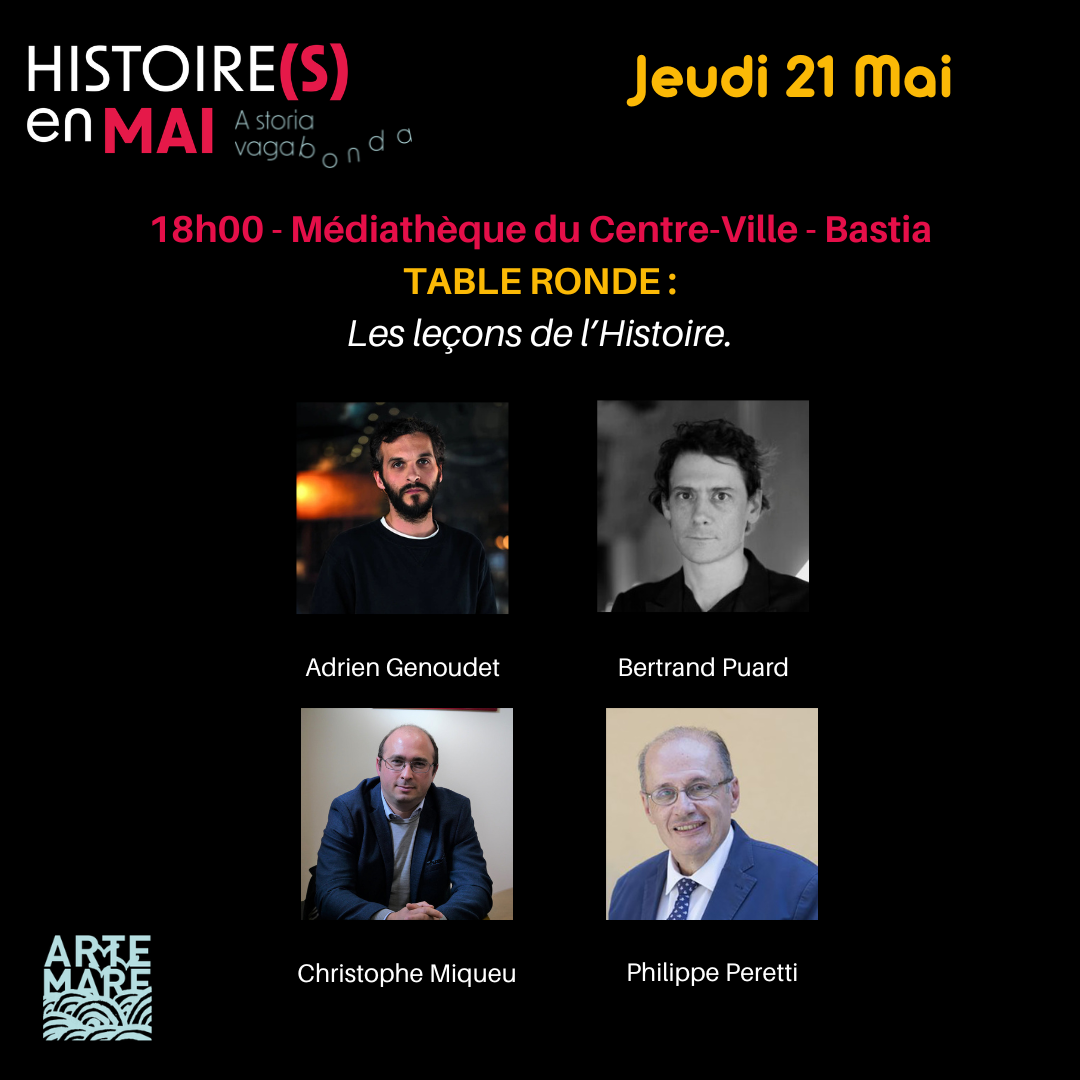 18h - Médiathèque du Centre-Ville - Bastia Table ronde : Les leçons de l’histoire Avec Adrien Genoudet, Bertrand Puard, Christophe Miqueu, Philippe Peretti Signatures avec Alma Librairie